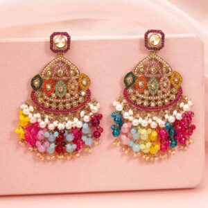 22K Antique Gold Plated Multi Colour Pearl Studded Statement Chandbali Earrings – Gold::Multi Color