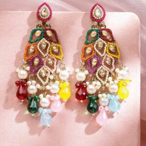 18K Gold-Plated Multicolor Kundan & Pearl Studded Handcrafted Long Chandelier Earrings