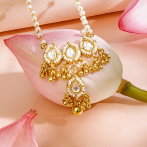 18K Gold-Plated Pearl Beaded Necklace with Kundan Pendant and Golden Drop Detailing