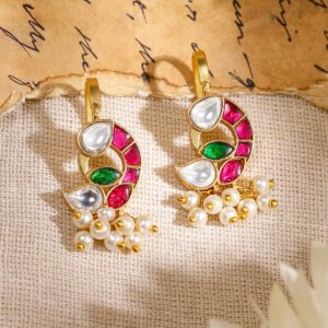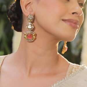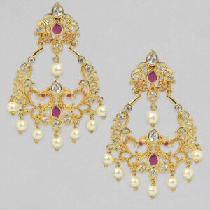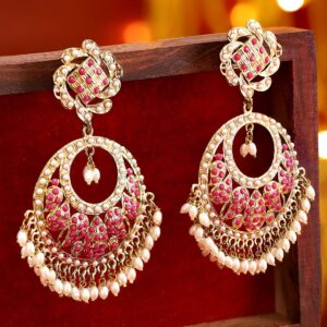 22K Antique Gold Plated Ruby Zirconia & Pearl Studded Statement Chandbali Earring – Gold::Pink