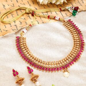 22K Gold-Plated Ruby Pink Stone & Pearl Drop Traditional Brass Jewellery Set