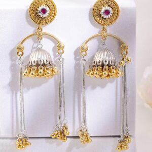 Dual-Tone Oxidized Silver-Plated Gold Beaded Dome Jhumka Earrings with Ruby & Chain Dangles
