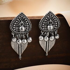 Oxidised Silver Plated Handcrafted Leaf Shape with Ghungroo Drop Earrings – Silver