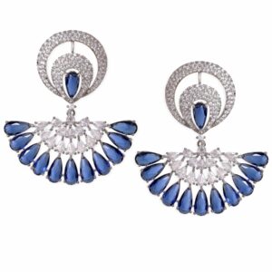 Rhodium Plated Blue Sapphire Zirconia Studded Chic Dangle Earrings – Silver::Blue