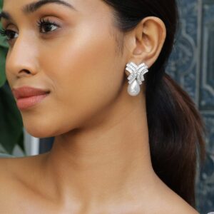Rhodium-Plated Cubic Zirconia Studded Floral Earrings with White Pearl Drop – Silver