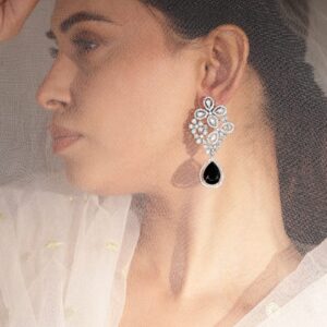 Rhodium Plated Cubic Zirconia Studded & Black AD Drop Earrings