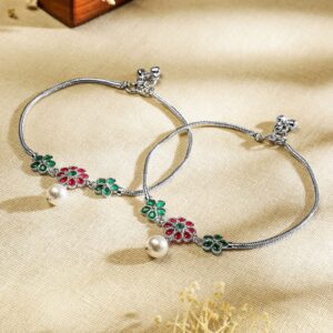 Set of 2 Oxidized Silver-Plated Ruby Pink & Emerald Green Kundan Floral Anklets with Pearl Accents