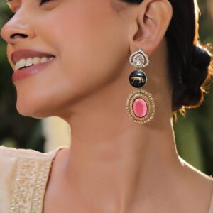 24K Gold-Plated Drop Earrings with Black Enamel, Pink Gemstone & Zirconia Detailing