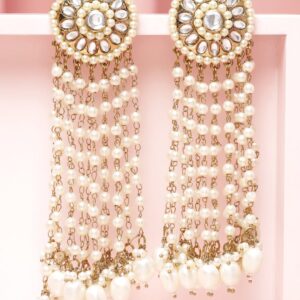 18K Gold-Plated Kundan Studded Multilayer White Pearl Beaded Drop Chandelier Earrings