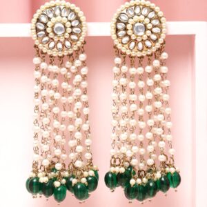 18K Gold-Plated Kundan Studded Multilayer Pearl Beaded Green Drop Chandelier Earrings
