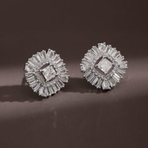 Rhodium-Plated White Cubic Zirconia Studded Geometric Stud Earrings – Silver