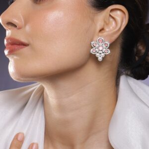 Rhodium-Plated Ruby Pink Stone & White Cubic Zirconia Studded Classic Floral Stud Earrings