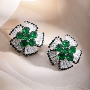 Rhodium-Plated Emerald and Crystal Floral Stud Earrings – Gold