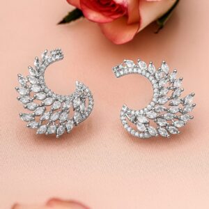 Rhodium Plated White Cubic Zirconia Studded Handcrafted Feather Shaped Statement Stud Earrings