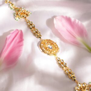 22K Gold-Plated Emerald & Ruby Kundan Studded Cream Pearl Beaded Handcrafted Head Jewellery for Brides & Bridesmaids