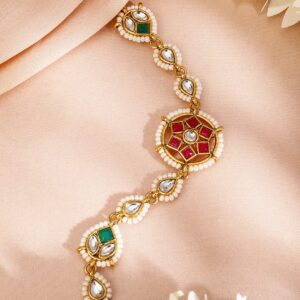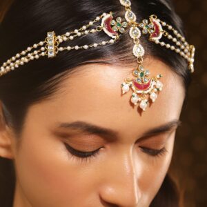 18K Gold-Plated Red, Green & White Kundan & Pearl Beaded Matha Patti Head Jewellery – Multicolor