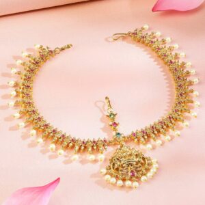 22K Gold-Plated Lakshmi Motif Ruby Red & Emerald Green Stone & Pearl Beaded Traditional Bridal Matha Patti – Gold