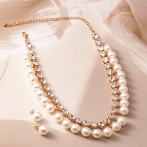 22K Gold-Plated Pearl Beads & White Cubic Zirconia Handcrafted Necklace Set – Gold