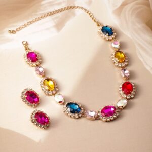 18K Gold Plated Multicolor Crystal AD & Zirconia Studded Statement Necklace Set – Gold