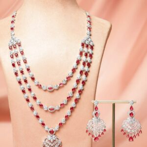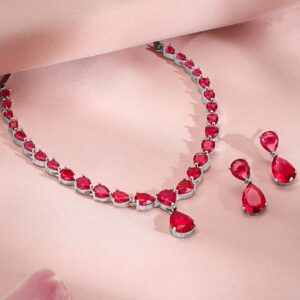 Premium Rhodium Plated Ruby Red Studded Statement Jewellery Set – Silver
