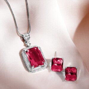 Rhodium-Plated Ruby & CZ Studded Pendant Necklace Set – Red