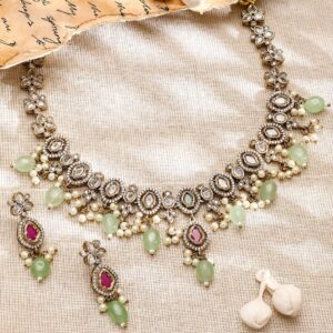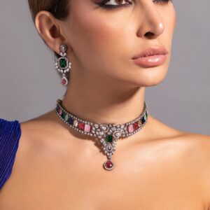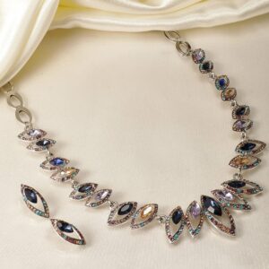 Silver Plated Multicoloured Stone Studded American Diamond Necklace Set. – Silver