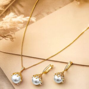 18K Gold-Plated Pearl & Cubic Zirconia Studded Pendant Necklace & Earrings Set – Gold