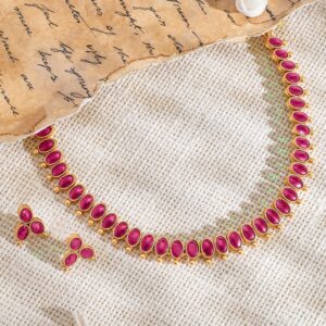 18K Gold-Plated Ruby Pink Studded Traditional Necklace Set – Gold