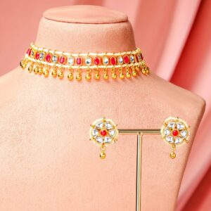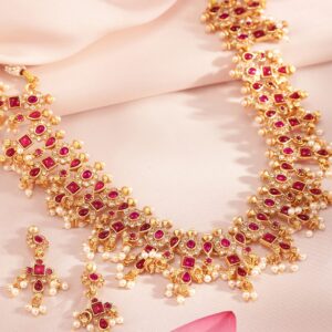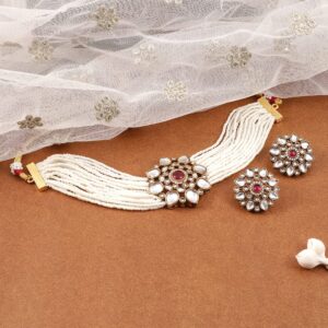 22K Gold-Plated Kundan & Ruby Studded White Pearl Beaded Floral Choker Necklace Set – ruby