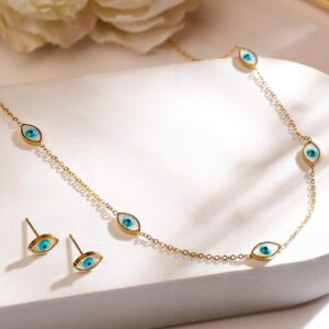 18K Gold-Plated Stainless Steel Tarnish-Free Waterproof Evil Eye Necklace Set – Blue