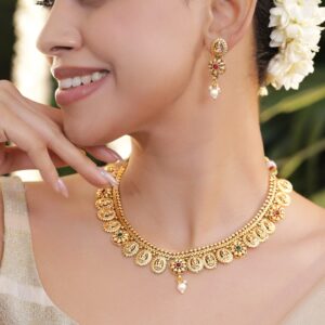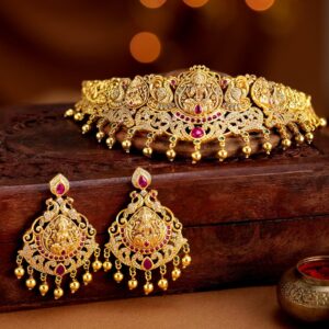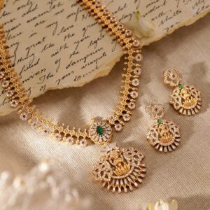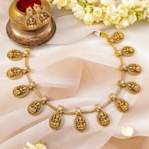 22K Gold-Plated Cubic Zirconia Studded Divine Lakshmi Temple Jewellery Set – Gold