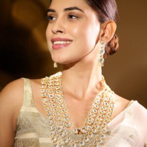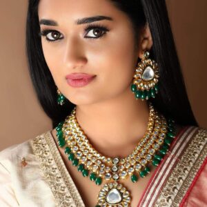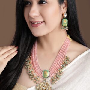 22K Gold Plated White & Green Kundan Studded & Beaded Multilayered Jewellery Set – Pink & Meant Green