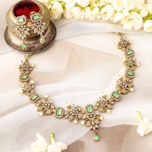 22K Gold-Plated Light Green & Cubic Zirconia Studded Necklace Set with Pearl Drops
