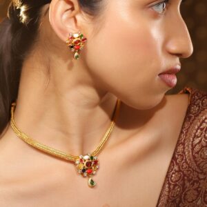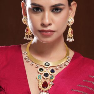 22K Gold-Plated Multicolor Gemstone Studded Brass Traditional Necklace Set – Multicolor