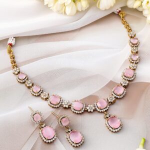 22K Gold-Plated Pastel Pink Stone & Cubic Zirconia Studded Necklace Set with Matching Earrings