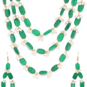 22K Gold-Plated Emerald Stone Studded Necklace Set with Gold Beads and Pearl Drops – Green