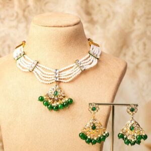 22K Gold-Plated White Pearl Multi-Strand Necklace Set with Kundan & Emerald Green Beads – Emerald