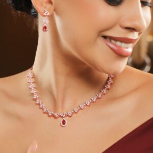 22K Rose Gold-Plated Ruby Pink & White Cubic Zirconia Studded Necklace Set with Earrings – Rose Gold