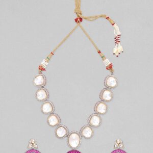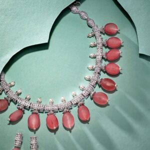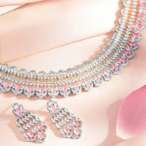 Rhodium-Plated Pastel Pink AD Stone & Cubic Zirconia Studded Choker Necklace Set – Silver