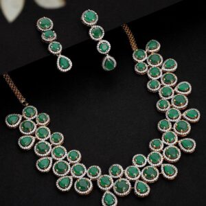Rhodium Plated AD & Cubic Zirconia Studded Teardrop Statement Jewellery Set – Green
