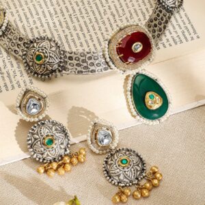 Oxidised Silver-Plated Choker Necklace Set with Ruby, Emerald, Pearl & Gold Beads – Ruby & Green