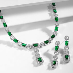 Rhodium-Plated Cubic Zirconia Studded Emerald Necklace and Earrings – Silver