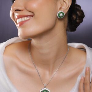 Rhodium-Plated Emerald Green & White Cubic Zirconia Studded Classic Premium Floral Pendant Necklace Set