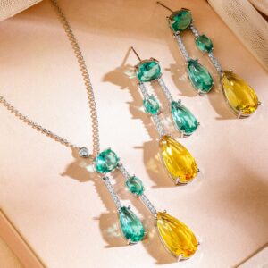 Rhodium-Plated Emerald Green & Yellow Crystal Cubic Zirconia Studded Luxurious Pendent Necklace Set