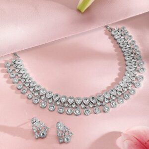 Rhodium plated Floral motif pave AD Studded Necklace set – Silver