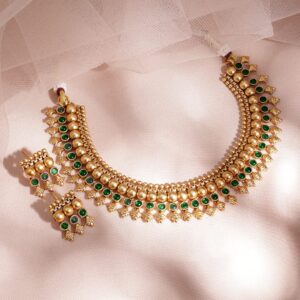 22K Gold-Plated Emerald Green Studded Traditional Choker Necklace Set with Gold Beads