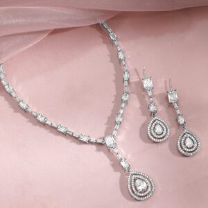 Rhodium Plated AD & Cubic Zirconia Studded Necklace Set with Teardrop Pendants – Silver