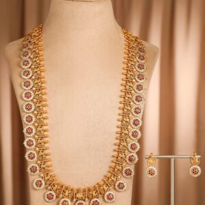 22K Gold-Plated White & Green Kundan Temple Floral Mid Length Brass Necklace Set