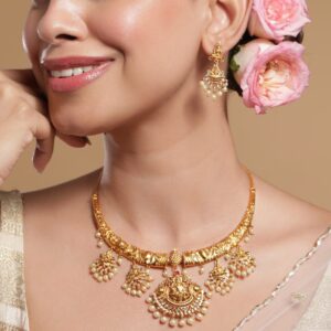 22K Gold-Plated Divine Lakshmi Temple Choker Necklace Set with White Pearl Drops