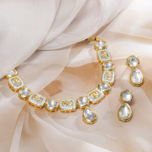 22K Gold-Plated Handcrafted White Kundan Luxe Choker Necklace Set with Pastel Blue Enamel Detailing